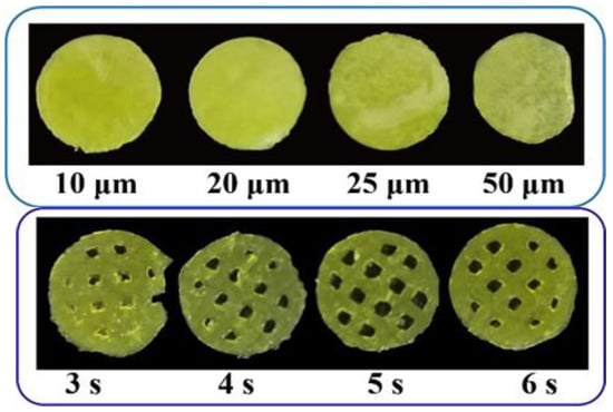 Three models of oral films were designed by Solidworks 2018 software [28] (solid sample, hollow mesh, concentric circle hole), as shown in Figure 2, with a diameter of 10 mm and a thickness of 300 μm. Three model entities were prepared based on the Section 2.2 formulations of printing. Under the condition that the exposure time of each layer (3 s) was constant, three different models were printed one by one with adjusting different layer heights (20, 30, 50 μm). Then, under the fixed layer height (20 μm), the exposure time of each layer was adjusted (3, 4, 5 and 6 s). Table 5 provides the predesigned printing parameters to investigate the influence of layer height and layer-by-layer exposure time on printing formability.