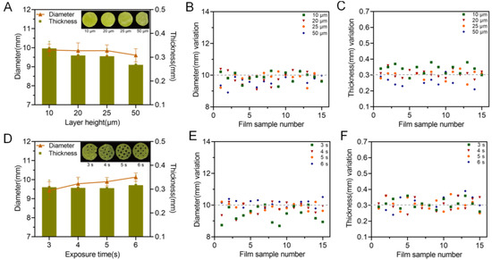 Influence of printing parameters on the printability of the oral films. Exposure time and layer height; (A) effect of layer height on the diameter and thickness of 3D-printed oral films (n = 15); (B) diameter variations and (C) thickness variations of 3D-printed oral film samples from (A); (D) effect of exposure time on the diameter and thickness of 3D-printed oral films (n = 15); (E) diameter variations and (F) thickness variations of 3D-printed oral film samples from (D).
