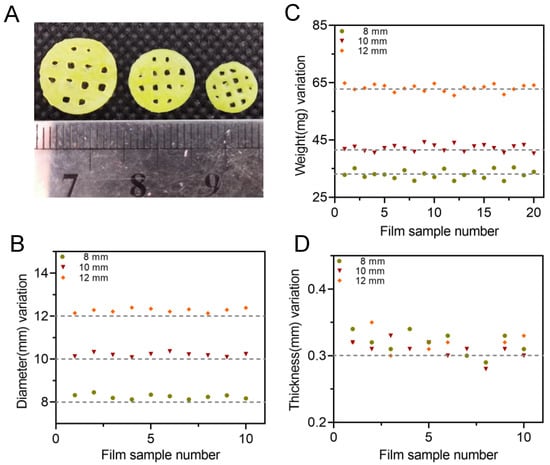(A) Appearances of 3D-printed oral films with three different diameters; (B) diameter variation of oral films (n = 10); (C) weight variation of oral film (n = 20) and (D) thickness of oral films (n = 10).