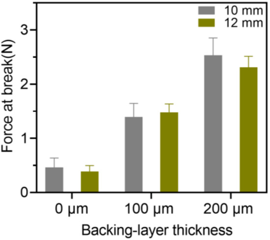 The breaking force of the 3D-printed oral films was further investigated, and the results are shown in Figure 10. Firstly, the size of the 3D-printed oral films did not have a big impact on the breaking force thereof; however, the thickness of the backing layer did. As shown in Figure 10, the breaking force of the single-layer film was about 0.5 N, which was dramatically increased with the presence of the backing layer. Additionally, a thicker backing layer resulted in a stronger breaking force of the achieved oral films. However, if the backing layer is too thick, it would increase the sensation of foreign films in the mouth and reduce the patient’s compliance.