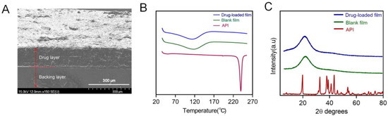 DSC: The API, blank films and drug-loaded bilayer films were analyzed by differential scanning calorimetry (DSC1/700, Mettler-Toledo, Zurich, Switzerland). About 10 mg of powder samples were weighed and put into aluminum pans, then heated from 30 to 260 °C at a heating rate of 10 °C/min under a nitrogen atmosphere.