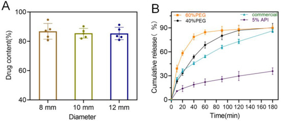 (A) Drug content of the 3D-printed bilayer oral films (n = 6); (B) in vitro drug cumulative release from the 3D-printed bilayer oral films.