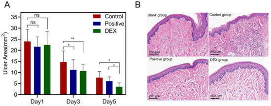 (A) Ulcer area changes of the model, positive and DEX groups after treatments (n = 4, * p < 0.05, ** p < 0.01, ns: no significant difference); (B) HE staining results of different groups after treatments.