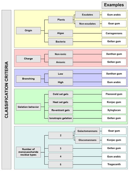The term ‘gum’ is used to describe natural polysaccharides displaying the ability to form viscous solutions or gels upon contact with water [8]. Depending on the origin, gums can be classified as microbial, seaweed- and plant-derived compounds. Gums obtained from plants can be further divided into exudate compounds, which are produced as a result of a mechanical injury or bacterial infection in a process called gummosis, and non-exudate compounds, which can be extracted from seeds or other plant tissues. Taking into consideration the chemical composition of gums in general, it is obvious that this class of compounds is wide and structurally diverse. In general terms, they can be considered as heteroglycans with different composition schemes, ranging from two monosaccharide unit types, such as in galactomannans, to more complex systems, such as gum ghatti or tragacanth, which are penta-heteroglycans [9,10]. It is noteworthy that the ratio of particular components, as well as the degree of backbone branching, can be important for the physicochemical characteristics, including the swelling ability of the gum [11]. Moreover, the particular compounds may have non-ionic properties, such as xanthan and guar gums, or carry a negative charge in the molecule, like gellan and karaya gums. The structural differences may also be related to different gelation behaviors, e.g., gellan gum reveals the ability to interact with divalent and trivalent cations, known as ionotropic gelation [12], xanthan gum gel formation ability is not temperature dependent [13] and konjac gum requires the presence of alkaline environment and heating [14]. The classification of naturally occurring gums according to different criteria is presented in Figure 1.