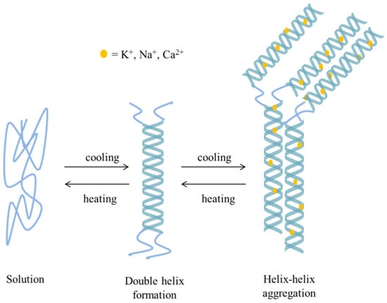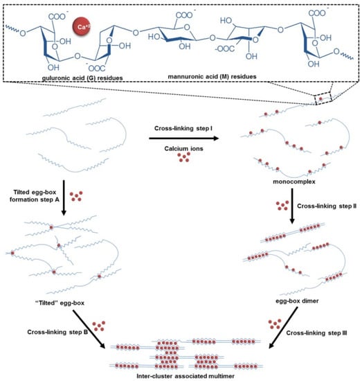 The ionic crosslinking process is typical for some gums that can interact with di- or trivalent cations, such as gellan gum or alginate. The cations interact with negatively charged parts of polysaccharide, forming bridges and thus initiating the formation of a gel structure. The active ingredient is entrapped between the crosslinked polysaccharide chains. It should be noted that the process is reversible and the applied crosslinking agents are usually considered as mild, which makes the obtained products fully biocompatible. In the case of alginate, the sodium ions are usually replaced with calcium cations and the gel formation process consists of a few steps. In the initial stage, the monocomplexes are formed; in the further steps, they transform into dimers and multimers, which is commonly known as the egg-box model [40]. According to another theory [41], the crosslinked polymer chains forming the dimer are not aligned in a parallel way but are approximately perpendicular to each other. In this way, a tilted egg-box structure is formed. The scheme depicting the formation of the mentioned structures is presented in Figure 3. Similar properties are widely described for gellan gum [42,43,44]; however, the whole process is more complex, as it is also temperature dependent. The polymer dissolves in water and forms random coils at temperatures exceeding 40 °C. Upon cooling, random coils transform into helices, which further aggregate into a reversible gel structure. The addition of cations induces the formation of ionic bridges between the helices and the aggregates formed in this way are stronger and do not undergo the reverse reaction, as it is seen for the ones obtained as the result of cooling alone [43]. Moreover, gellan gum occurs in low-acyl and high-acyl forms, which also affects the gelation process [12].