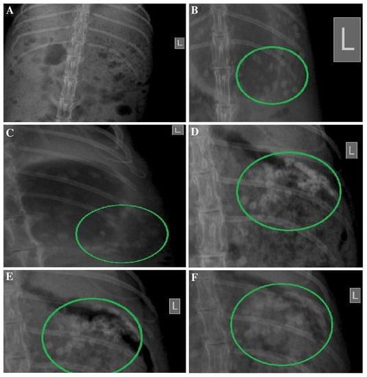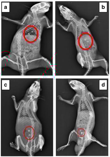X-ray images of rats treated with barium sulfate-loaded microparticles obtained after (a) 2, (b) 4, (c) 6, and (d) 6 h. The red circles indicate the presence of BaSO4-loaded microparticles. Reproduced from [75] with permission.