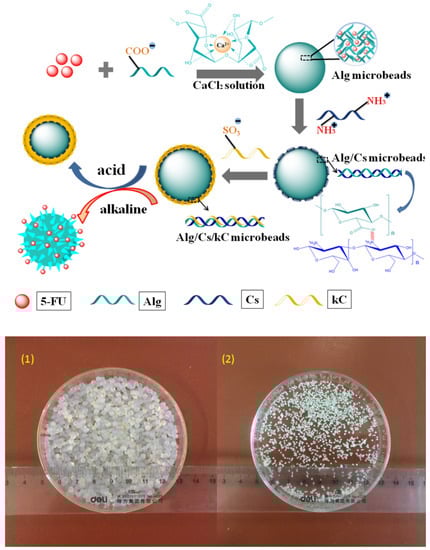 Scheme for the preparation of 5-fluorouracil-loaded alginate (Alg) microbeads with a chitosan (Cs) and carrageenan (kC) coating, and digital photographs of freshly prepared (1) wet and (2) dry microbeads. Reproduced from [99] with permission.