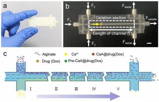 As was mentioned above, because of the simplicity, cost-effectiveness and non-toxicity of the applied reagents, ionotropic gelation is the most frequently utilized manufacturing technique in the case of alginate-based microgels. The most popular technique applied to obtain ion-crosslinked alginate is related either to instilling droplets of one solution into another or to preparing an emulsion. However, there are also some studies involving different techniques. For example, Cai et al. [100] prepared 3D-printed microfluidic chip to mix alginate and crosslinking solutions and in this way improve the control of the ionotropic gelation process (Figure 9). The chip was concentration-controlled and the particle size could be regulated with the length of the central channel in the chip, as well as a flow rate ratio. In the study, an efficient alternative method to obtain microgels loaded with doxorubicin was presented, with investigations regarding the impact of the chip construction features on the particles properties. In fact, the obtained placebo gel diameter was within a nanometer range (327–514 nm) while the drug-loaded particles were larger (388–1655 nm). The particles containing doxorubicin were also tested for the zeta potential, drug release and cytotoxicity towards epithelial cell lines applied in studies focusing on breast cancer. All performed studies indicate that the developed and described method can be useful to produce alginate particles with designed properties and to avoid some of the difficulties encountered with conventional ionotropic gelation methods. Microgel fabrication with microfluidic chips was also reported in other studies [100,101,102,103].