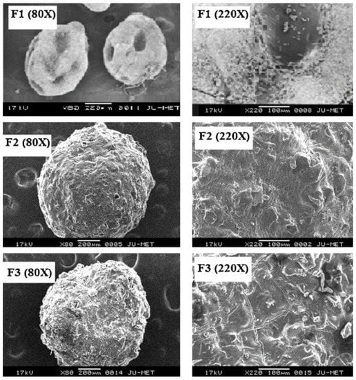 Scanning electron micrographs of resinate-loaded hydrogel beads with 80× and 220× magnification [carboxymethyl xanthan gum hydrogel, prepared with ionic crosslinking (F1), simultaneous ionic and chemical crosslinking (F2) or sequential ionic and chemical crosslinking (F3)]. Reproduced from [127] with permission.