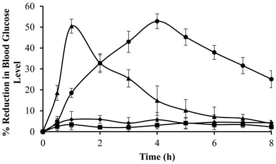 Preclinical efficacy of XGD6 hydrogel particles [CMXG + CEXG acetylated hydrogel containing repaglinide]. Key: diabetic control (◆), negative control (■), pure repaglinide suspension (▴) and XGD6 formulation (●). Reprinted from [122] with permission.