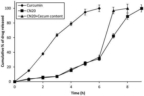 In their investigation, Zhou et al. [67] used gum arabic and also other polysaccharides such as carboxymethyl cellulose (CMC), alginate, pectin and carrageenan as the components for the preparation of egg yolk proteins/polysaccharide nanogels. They characterized the prepared particles for physical-chemical properties and also checked stabilities under simulated gastrointestinal conditions (SGI). In the investigation curcumin was used as the model lipophilic compound. The examination was performed for four curcumin/protein mass ratios, i.e., 0.5%, 1%, 1.5% and 2.5%. The evaluation was based on the encapsulation efficiency and loading capacity, also molecular interactions were described. Finally, the release of curcumin from protein-based nanogels was investigated by a dialysis method. Nanogels were spray-dried to obtain ultra-fine nanogel powder. The morphology and homogeneity of dry powders were studied by scanning electron microscopy (SEM) and the effects of used polysaccharides on these properties were described. The investigation showed that the polysaccharides were all able to form complexes with egg yolk lipoproteins. The obtained nanogels had a uniform particle size below 85 nm and displayed zeta potential >30 mV. Evaluated nanogels prepared with all polysaccharides received similar encapsulation efficiency and loading capacity [67]. The release study showed that dissolution in the gastric phase of free curcumin reached 76% during the 120 min. It was much more rapid compared to the release from nanogels. The fast diffusion of free curcumin was continued after transfer to simulated intestinal fluid and was complete in 210 min. All investigated nanogels showed a sustained-release profile of curcumin both in gastric and intestinal pH. Complexation with pectin and gum arabic gave moderate and similar prolonged release of curcumin in acidic condition, with approximately 55% of curcumin released. During incubation at pH 7.5, the nanogel with pectin showed a slower release than the nanogel with gum arabic. Among all three types of investigated nanogels, complex with CMC demonstrated the slowest kinetic release and the smallest accumulative release in both used conditions (gastric and intestinal).