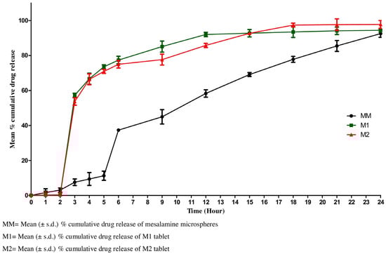 Patole and Pandit [98] prepared mesalamine-loaded alginate-based microparticles, which were loaded to hydroxypropyl methylcellulose (HPMC) capsules coated with Eudragit® FS-30D (Evonik Industries Ltd., Mumbai, India) to improve the resistance to acidic conditions of the stomach. The particles were prepared with the use of a water-in-oil emulsion crosslinking method and as a crosslinking agent CaCl2 isopropanol solution was used. In the drug release studies performed for dried beads alone in acidic conditions, burst release was observed, which is not favorable in the case of a formulation intended to exert therapeutic action in the colon. The observed effect could be related to the high porosity of the beads, the dissolution of the polymer in an acidic medium and an insufficient concentration of the polymer, which might lead to the increased contact of the incorporated drug with the dissolution medium. Therefore, the application of an acid-resistant capsule shell was necessary to deliver the drug to the colon. The drug release studies performed for capsules with the use of simulated intestinal fluid and simulated colon fluid with the addition of rat fecal content revealed a significant increase in the drug release rate in the latter case. The observed effect was related to bacterial degradation of alginate and confirms that drug incorporation into alginate matrix improves selectiveness towards the colon. In vivo studies performed for microspheres proved their efficacy in mice with induced ulcerative lesions.