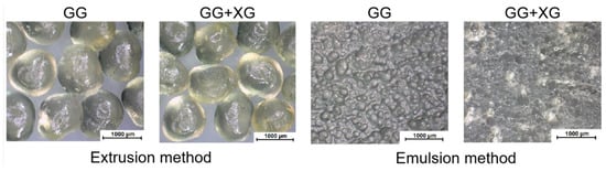 Among the earliest examples of such applications is the work of Maiti et al. regarding the encapsulation of bovine serum albumin (BSA) [123,124]. Initially, the authors simply induced gelation by injecting the BSA in sodium CMXG solution into aluminum chloride solution. It was observed that microparticles could be formed only in the pH range of 4–8 and that divalent cations (calcium, barium) were unsuccessful in crosslinking the material. The microparticles shape was found to depend on CMXG concentration (and hence solution viscosity), with optimum spherical shape at 1–2%. Below these values, the microparticles were elongated and flat, while they were elongated with tails above [123]. It was also found that an increase in AlCl3 concentration (1–5%) resulted in a larger bead size (as more crosslinked, denser gel hinders water efflux and microparticle shrinkage), lower entrapment efficiency (EE) (drop from 86 to 61%), as well as a less spherical and more indented particle shape [124]. BSA release was pH dependent, with 96–98% released at pH 7.4 and ~40% in simulated gastric fluid (SGF) [123]. Since the authors considered the release in an acidic medium to be excessive for oral protein delivery, the gelation process was modified by adding a coating hydrogel layer to the original microparticles. For this purpose, the microparticles were immersed in sodium CMXG solution and transferred again to AlCl3 or alternatively, transferred to calcium chloride solution and immersed in sodium alginate, followed by final alginate gelation in CaCl2 solution. The coating procedure reduced BSA release in SGF to 10–15%, as well as slowed the release in PBS. CMXG layer was thicker and retarded the release at pH 7.4 more efficiently than the alginate one, with slightly larger microparticle size (1330 vs. 1290 µm) and final encapsulation efficiency of 79%. The loading process did not affect protein stability [124].