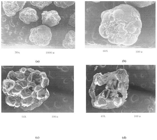 Similar effects of crosslinking conditions were observed in studies on CMXG encapsulation of dilitiazem complexated on an exchange resin [125,126], which was intended to provide sustained release of the hydrophilic drug. Therefore, the findings of the abovementioned work on BSA [123,124] were supported by the results obtained by Ray et al.: CMXG concentration of 1.5–2.5% was necessary for spherical microparticle shape, and aluminum chloride concentration increase had a negative impact on EE. The most pronounced effect on encapsulation efficiency was exerted by gelation time, where extending it from 5 to 20 min led to EE drop from 95% to 79%. Additionally, similar to the work on bovine serum albumin, CMXG microgel alone was unsuccessful in providing sufficient sustained release: the system released approximately 80% of the drug in simulated intestinal fluid (SIF) in 2 h, and experienced even quicker burst to ~30% in SGF within 30 min [125]. To overcome this, diltiazem resinate-loaded CMXG beads were immersed in polyethylene imine (PEI) in order to form polyelectrolyte complex with CMXG, which would reduce pore size and permeability in the hydrogel network. By comparing different PEI concentrations (0.5–2%) and incubation times (5–30 min), it was observed that an increase in both values reduced EE (from 96.5% to 70%) on the one hand, but on the other hand, reduced the drug amount released at pH 1.2 end extended the release at pH 6.8 (with t50% value raised from 90 to 270 min). It was therefore confirmed that improved thickness and tightness of the polyelectrolyte membrane reduced diltiazem migration from the matrix. The optimal formulation (obtained with 1% PEI and 5 min incubation) was evaluated in vivo in rabbits. Compared to diltiazem solution, the developed CMXG-PEI system successfully prolonged the absorption after oral administration and enhanced relative bioavailability to 159% (with cmax reduced from 180 to 120 ng/mL and absorption rate constant from 0.854 to 0.625 h−1). With the sustained delivery system, a level A in vitro–in vivo correlation (IVIVC) between fraction released and fraction absorbed was also confirmed (R2 = 0.96) [126]. In another study of this series on CMXG-encapsulated diltiazem resinate, the effect of different crosslinking methods was explored. Three modes were compared: ionotropic gelation in 2.5% AlCl3 for 15 min, simultaneous ionotropic and chemical crosslinking in the solution containing 2.5% AlCl3 and 5% glutaraldehyde for 15 min, and sequential mode, where the microparticles were first gelled by 2.5% aluminum chloride, dried and subsequently crosslinked by glutaraldehyde (0.5–5% for 5–30 min). The bead size and morphology were influenced by the choice of method (Figure 12): the Al3+-crosslinked microparticles were the largest (1.18 mm), smooth and spherical, but partly collapsed during drying. On the other hand, the combined ionotropic and chemical crosslinking provided spherical microbeads with rough and striated surface (a result of inward shrinkage of the polymer chain during the reaction of aldehyde with –OH groups). The smallest size of 0.85 mm was recorded for the sequentially prepared hydrogel at the highest glutaraldehyde concentration due to more rigid structure. The EE was roughly comparable between the processes (80–88%). In a dynamic in vitro test with pH change, the ionotropically gelled microparticles gave the poorest performance due to looser, less crosslinked structure and free –OH groups available for hydrogen bonding with water, and sequentially crosslinked beads were the most efficient in slowing diltiazem release (mean dissolution time MDT 28.43 s vs. 35.95 at pH 1.2 and 38.73 s vs. 62.66 at pH 6.8, respectively) [127].