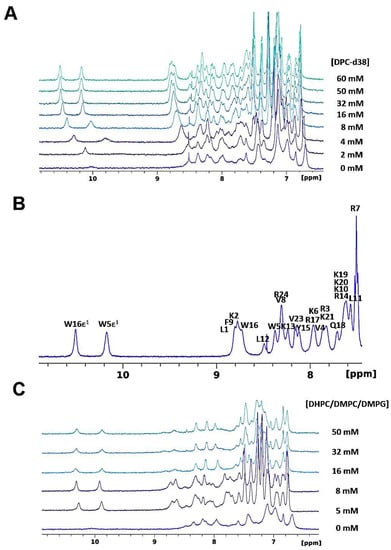 (A) The 500 MHz 1H NMR spectra (amide and aromatic region) recording during the titration of SAAP-148 with DPC:d38 micelles up to a concentration of 60 mM. (B) NMR assignment of the amide region of SAAP-148 in DPC micelles. (C) The 500 MHz 1H NMR spectra of the titration of SAAP-148 with DHPC/DMPC/DMPG isotropic bicelles up to a concentration of 50 mM. The temperature was 310 K.