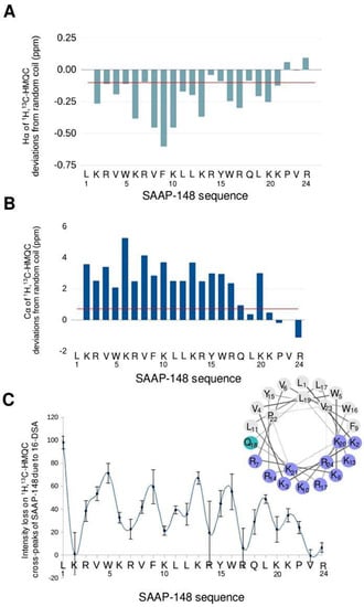 (A,B) Hα (A) and Cα (B) chemical shift deviations from random coil values (see Materials and Methods). (C) Percental intensity loss of Hα/Cα 1H,13C-HMQC peaks in the presence of paramagnetic 16-DSA. Insert shows a helical wheel for SAAP-148 peptide (created using Netwheels web server [88]).