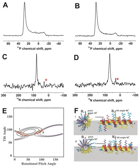 The anisotropy of the 15N chemical shift is used to determine the pitch and tilt angles of the helix formed by SAAP-148 in oriented systems. These two parameters refer to the angles formed by the long (tilt) and short (pitch) cylindrical helix axes with the bilayer normal (which is assumed to be along the magnetic field direction in oriented systems). The homogeneity of the lipid orientation, parallel to the magnetic field, was ascertained using 31P solid-state NMR spectra (Figure 3A,B). The predominant intensity around 30 ppm is indicative that most lipids are well aligned along the surfaces of the mechanical support while some intensity extends up to −15 ppm, suggesting a global deformation of the lipid bilayer concomitant with other conformations and/or alignments of the lipid head group [89].