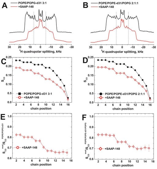 Once the orientation of the peptide was determined in our membrane models, the effect of SAAP-148 on the phospholipids and their order parameters was also investigated. This was achieved using 2H static solid-state NMR spectroscopy of liposomes where either POPG or POPE were 2H labeled along the palmitoyl chain (Figure 4A,B). The resulting 2H solid-state NMR spectra are characterized by superimposed quadrupolar splittings, which represent the order parameter of the various C–D bond vectors [91,92]. This implies that it is possible to calculate the order parameter of each position of the deuterated chain by measuring the corresponding quadrupolar splitting in the spectrum [91,92] (Figure 4C,D).