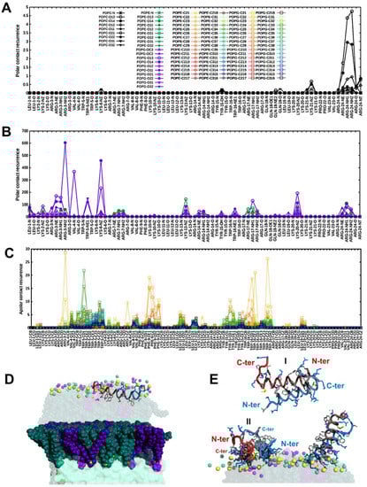 In order to highlight the occurrence of key interatomic interactions triggering the association of SAAP-148 with membranes, we estimated the occurrence of H bonds, salt bridges, and van der Waals contacts along the trajectory (Figure 5A–C). This was quantified by calculating the radial distribution function [64] of all peptide atoms from each phospholipid atom. While polar contacts (H bonds and salt bridges) are particularly informative to study the first stages of the interaction, van der Waals contacts mostly inform on the final stages, in case the peptide has been inserted into the membrane.