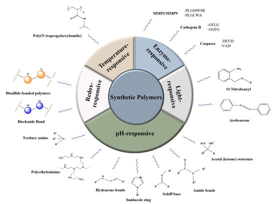 Synthetic polymers are versatile materials produced by a variety of chemical reactions. Due to their wide range of mechanical, thermal, and degradation properties, synthetic polymers have received increasing attention from the pharmaceutical industry. Over the past several years, synthetic polymer-based smart materials have become one of the most attractive research areas [38] (Figure 1).