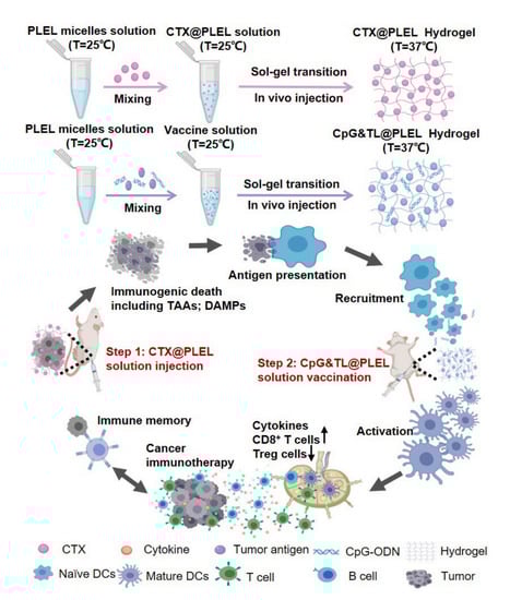 The development of cancer vaccines based on neoantigens holds great promise in cancer immunotherapy due to their ability to induce an effective antitumor immunity that lasts for a long time. Cyclophosphamide (CTX), an immunogenic cell death (ICD)-inducing drug, is a promising antigen source for cancer vaccines. A CTX-loaded, temperature-responsive poly (D, l-lactide)-poly (ethylene glycol)-poly (D, l-lactide) (PDLLA-PEG-PDLLA, PLEL) hydrogel was designed for CpG combined immunotherapy (Figure 2). In the CT26-bearing mice model, this strategy resulted in a cytotoxic T-lymphocyte response, which inhibits tumor growth and increases survival. By inducing a durable immune memory response, the hydrogel prevented tumor recurrence and distant tumor growth, facilitating the development of commercial tumor vaccines and combining chemotherapy with cancer vaccines in the clinic [114].