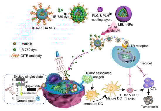 Ou et al. developed a pH-sensitive layer-by-layer hybrid nanoparticle (glucocorticoid-induced TNF receptor family-related protein/poly(lactic-co-glycolic acid, GITR-PLGA) loaded with IR-780 and imatinib (IMT) for cancer photoimmunotherapy (Figure 3). To prevent degradation and achieve stimulus-responsive effects in targeted locations under NIR exposure, the GITR-PLGA core was coated with a poly-L-histidine (PLH) and poly(ethylene glycol)-block-poly(L-glutamic acid) (PEG-b-PLG) layer. In B16/BL6 and MC-38 tumor-bearing mouse models, this system successfully eradicated tumor growth by apoptosis induction and tumor-associated antigen production. Meanwhile, CD8+ T cells were activated, and the suppressive function of Treg cells was reduced [123].