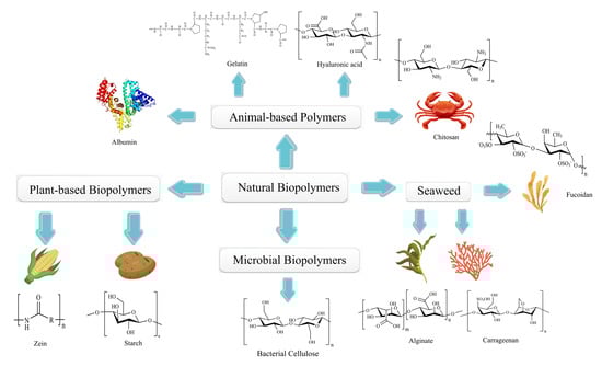 Naturally occurring biopolymers can be found in plants, animals, microbes, and marine organisms [125] (Figure 4). They are often used in biomedicine and the food industry. For example, food-grade colloids can be produced from animal proteins and polysaccharides, and gelatin polymers can be used for wound dressings [126]. It has been demonstrated that natural biopolymers have several beneficial properties over synthetic polymers, including bioadhesion, multiple bioactivities, excellent biocompatibility, low toxicity, and biodegradability [127]. Furthermore, most natural biopolymers are biocompatible, ensuring their distinct properties. Currently, most innovative natural products and drugs approved by the US Food and Drug Administration (FDA) are derived from microorganisms and plants. Crofelemer, for example, is derived from the red latex of the Peruvian croton, a plant in the Euphorbiaceae family. This biopolymer is the first oral botanical prescription drug approved by the FDA for treating non-infectious diarrhea symptoms in HIV/AIDS patients receiving antiretroviral therapy [128].