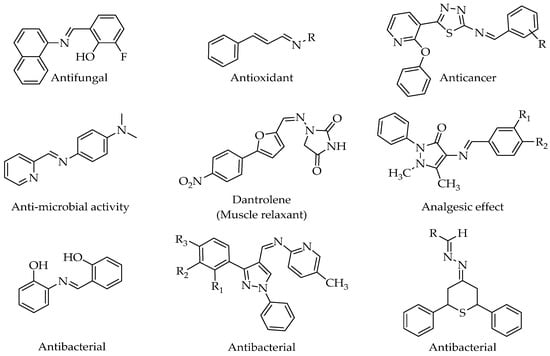 Heterocyclic compounds containing nitrogen atoms have various biological properties. Schiff bases as a crucial class of heterocyclic compounds show anticonvulsant, antidepressant, anti-inflammatory, analgesic, antimicrobial, antimalarial, anticancer, and antioxidant activities [26,27]. These chemicals are significant in the synthesis of many physiologically and medically active substances. Schiff bases and derivatives are also known as important intermediates for the synthesis of N-containing heterocyclic substances. They are commonly represented by the R-CH=N-Ar formula [28,29]. Schiff bases are commonly found in the structure of naturally occurring products. They have an important role in synthesis and pharmaceutical research. The chemical structures of some pharmacologically active Schiff bases are given in Figure 1.