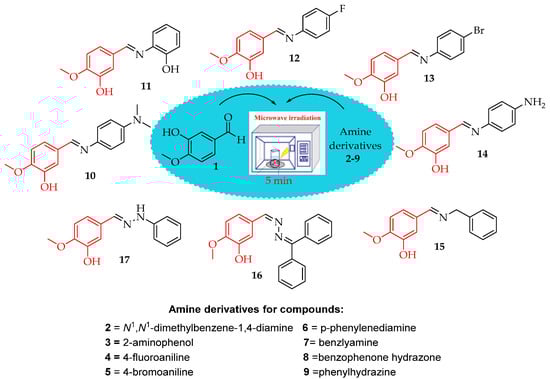 Recently, increasing studies on Schiff bases and the antioxidant activity of these bases encouraged us to carry out this study. In this work, we synthesized eight Schiff bases and hydrazineylidene derivatives (10–17) containing phenol rings using microwave irradiation (Scheme 1). Another important goal of this study is to examine the antioxidant abilities of these compounds. For this purpose, isovanillin (1) and different amine compounds (2–9) were used as starting compounds for the synthesis of eight different phenol ring-containing Schiff base derivatives (Scheme 1).
