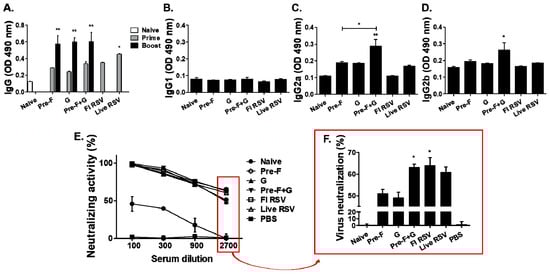 RSV-specific serum antibody responses were determined in mice as shown in Figure 2A–D. High levels of IgG antibody responses were observed in immunized mice (Figure 2A), especially after the boost immunization with a significantly higher level of IgG antibody response being elicited by VLP immunization groups (Pre-F, G, and Pre-F+G) compared to the naïve group (* p < 0.05, ** p < 0.01). IgG subclasses IgG1, IgG2a, and IgG2b antibody responses were assessed after boost immunization (Figure 2B–D). Overall, low IgG1 responses were observed (Figure 2B). In contrast, significant increases in IgG2a and IgG2b responses were detected from the sera of Pre-F+G VLP-immunized mice compared to control mice (Naive, FI RSV, Live RSV; Figure 2C,D, * p < 0.05, ** p < 0.01). To confirm that the neutralizing antibody was successfully induced by the VLP vaccines after boost immunization, viral titers were measured in vitro (Figure 2E,F). As shown in Figure 2F, high levels of virus-neutralizing antibody responses were observed from the sera of immunized mice compared to naïve sera. Significant differences were only observed in Pre-F+G VLP (63%) and FI-RSV (63.8%) groups in comparison to naïve control, while Pre-F VLP immune sera only elicited roughly 50% virus neutralization (Figure 2F, * p < 0.05).