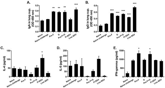 Antibody responses in the lung and cytokine responses in the spleen. Respiratory syncytial virus (RSV) A2-specific IgA (A) and IgG (B) responses were detected from lung extracts of mice collected at day 5 post-challenge. Significantly higher levels of IgA and IgG responses were observed in immunized mice than naïve challenged mice ((A,B); ** p < 0.01, *** p < 0.001). Splenic cytokines were detected by culturing splenocytes with formalin-inactivated RSV (2 µg/mL) for 6 days. IL-4 (C), IL-5 (D), and IFN-γ (E) production were measured and the mean values were compared to control groups (* p < 0.05).