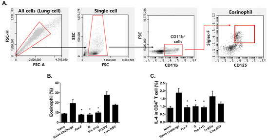 Single cells isolated from the lungs were used to assess CD4+ T cell, CD8+ T cell, and eosinophil populations via flow cytometry as previously described []. Cells were stimulated with a mixture containing equal concentrations of RSV fusion and glycoprotein (Sino Biological, Beijing, China) at a final concentration of 2 µg/mL for 5 h at 37 °C. Cells were subsequently stained with fluorophore-conjugated CD3, CD4, CD8, CD11b, CD125, Siglec F, and IL-4 antibodies (BD Biosciences, Franklin Lakes, NJ, USA). Antibody-stained cells were analyzed using a BD Accuri C6 Flow Cytometer (BD Biosciences, Franklin Lakes, NJ, USA). For cytokine assay, spleens were homogenized, and isolated splenocytes were cultured in RPMI-1640 media (Lonza, Switzerland) with 2 µg/mL of the RSV fusion and glycoprotein at 37 °C for 6 days. Culture supernatants were carefully collected, and the expressions of the cytokines IL-4, IL-5, and IFN-γ were assessed using BD OptEIA ELISA kits (BD Biosciences, Franklin Lakes, NJ, USA).