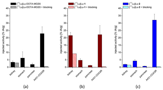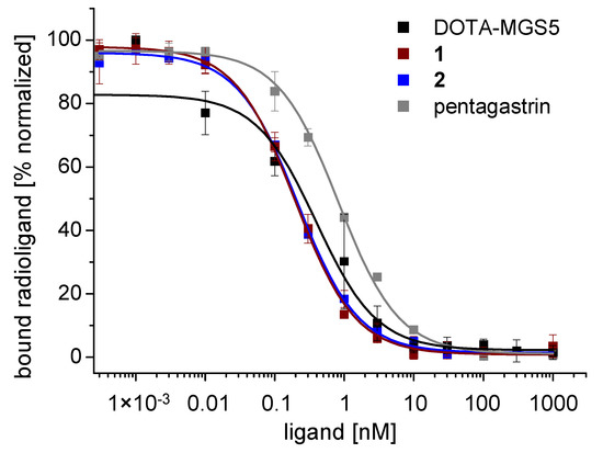 - Klingler, M.; Summer, D.; Rangger, C.; Haubner, R.; Foster, J.; Sosabowski, J.; Decristoforo, C.; Virgolini, I.; von Guggenberg, E. DOTA-MGS5, a New Cholecystokinin-2 Receptor-Targeting Peptide Analog with an Optimized Targeting Profile for Theranostic Use. J. Nucl. Med. 2019, 60, 1010–1016. [Google Scholar] [CrossRef]