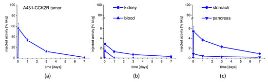 - Laverman, P.; Joosten, L.; Eek, A.; Roosenburg, S.; Peitl, P.K.; Maina, T.; Mäcke, H.; Aloj, L.; von Guggenberg, E.; Sosabowski, J.K.; et al. Comparative Biodistribution of 12 111In-Labelled Gastrin/CCK2 Receptor-Targeting Peptides. Eur. J. Nucl. Med. Mol. Imaging 2011, 38, 1410–1416. [Google Scholar] [CrossRef]