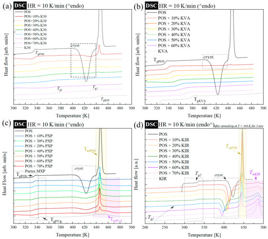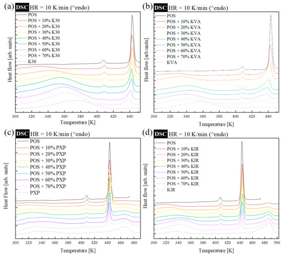 In the first step of our studies, the impact of the chosen polymers (at concentrations of 10, 20, 30, 40, 50, 60, and 70%) on the melting temperature of POS was investigated. For that purpose, non-isothermal DSC experiments of the physical mixtures were performed. During these experiments, the samples were heated at a rate of 10 K/min. All compositions were investigated at 298 K, while the final temperature depended on the polymer employed. For compositions containing K30 or KVA, the sample was heated up to 453 K. In the case of the systems with PXP or KIR, the final temperature was equal to 488 or 503 K, respectively. Each sample was investigated in triplicate. The representative DSC traces are summarized in Figure 2. To make the analysis clearer, in each panel of Figure 2, the DSC thermograms of as-received neat crystalline POS, and neat polymers, have been added.