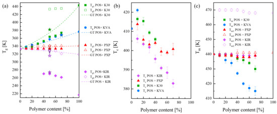 To better visualize how the employed polymers modify the glass transition, the onset of crystallization, and the melting temperature of POS, these data are summarized in Figure 4a–c, respectively. In Figure 4a, the theoretically determined concentration dependences of Tg for each system are also presented. The dependencies have been calculated based on the Gordon and Taylor approach [60,61]: