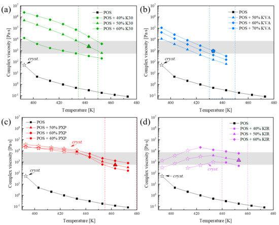 Figure 6 compares the effect of temperature on melt viscosity for all investigated POS-based systems, using the viscosity values determined at f = 1 Hz. As can be seen, samples become more viscous when the temperature decreases, or polymer content increases. In the case of neat POS, and systems containing PXP or KIR polymer, the POS’s recrystallization was observed during sample cooling, proving these materials’ low physical stabilities. The viscosity values determined from partially crystalline systems are marked as star symbols. Figure 6 also shows the area where each tested system melts (see areas between dashed lines, which were obtained based on calorimetric data). By correlating these values with viscosity values suitable for HME (i.e., ‘shaded area’), it is easy to determine which of the tested concentrations of given API + polymer systems are the most suitable for the extrusion process. Comparing the effect of investigated amorphous polymers on the melt viscosity of POS, it is seen that about a 20% lower amount of K30, which is more viscous than KVA, is needed to obtain a binary drug–polymer system with the appropriate characteristics of extrusion melt viscosity. While, to make POS’s melt viscosity suitable for HME in the binary systems containing any of the employed semi-crystalline polymers (KIR or PXP), nearly the same amount of the additive is required. Summarizing, employing as much as 70% KVA or 50% K30, PXP, or KIR is necessary to make POS’s viscosity in its melting temperature area appropriate for HME.