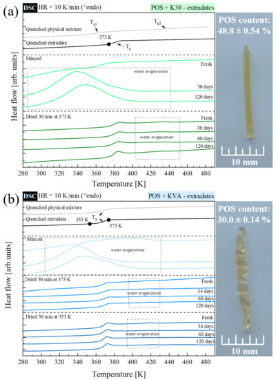 DSC thermograms of (a) POS + 50% K30 quenched physical mixture—gray line; quenched extrudate—black line; minced and non-dried extrudate (fresh, and stored for 30 and 120 days)—light green lines; minced and dried for 30 min at 373 K extrudates (fresh, and stored for 30, 60, and 120 days)—dark green lines. DSC thermograms of (b) POS + 70% KVA quenched physical mixture—gray line; quenched extrudate—black line; minced and non-dried extrudate (fresh, and stored for 34, and 120 days)—light blue lines; minced and dried for 30 min at 373 K extrudates (fresh, and stored for 34, 60, and 120 days)—intermediate blue lines; and minced and dried for 30 min at 353 K extrudates (fresh, and stored for 34, 60, and 120 days)—dark blue lines. On the right-hand side, POS-based extrudates are shown.