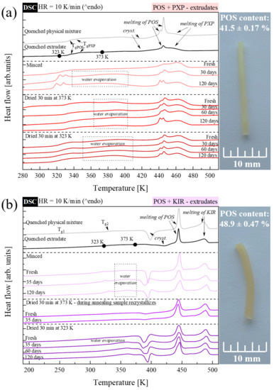 DSC thermograms of (a) POS + 50% PXP quenched physical mixture—gray line; quenched extrudate—black line; minced and non-dried extrudate (fresh, and stored for 30 and 120 days)—light red lines; minced and dried for 30 min at 373 K extrudates (fresh, and stored for 30, 60, and 120 days)—intermediate red lines; and minced and dried for 30 min at 323 K extrudates (fresh, and stored for 30, 60, and 120 days)—dark red lines. DSC thermograms of (b) POS + 50% KIR quenched physical mixture—gray line; quenched extrudate—black line; minced and non-dried extrudate (fresh, and stored for 5 and 120 days)—light purple lines; minced and dried for 30 min at 373 K extrudates (fresh, and stored for 35 days)—intermediate purple lines; and minced and dried for 30 min at 323 K extrudates (fresh, and stored for 35, 60, and 120 days)—dark purple lines. On the right-hand side, POS-based extrudates are shown.
