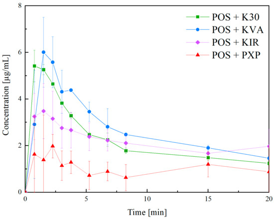 The dissolution profiles of POS + K30, POS + KVA, POS + KIR, and POS + PXP extrudates.