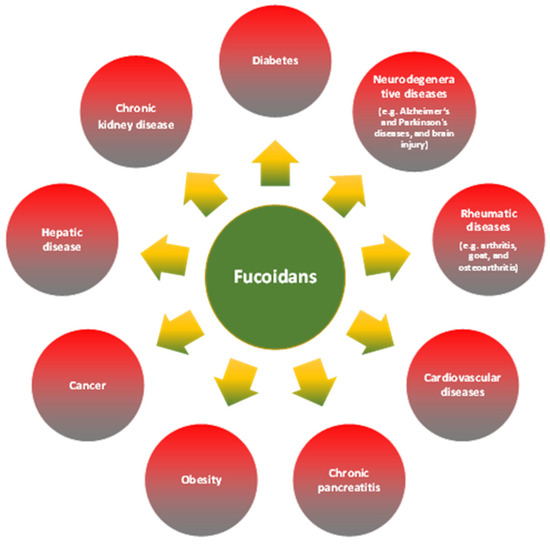 - Luthuli, S.; Wu, S.; Cheng, Y.; Zheng, X.; Wu, M.; Tong, H. Therapeutic Effects of Fucoidan: A Review on Recent Studies. Mar. Drugs 2019, 17, 487. [Google Scholar] [CrossRef]