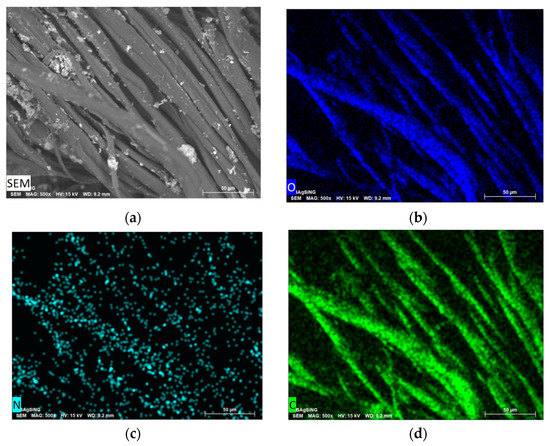 The data obtained made it possible to suggest the structure of the hybrid material: the basis is cotton, which provides strength characteristics and the fibrous–porous structure of which effectively stabilizes the silver-containing organosilicon nanogel. It is responsible for the physical or chemical sorption of the metal polymer on the polysaccharide. The upper layer of the material is almost completely formed from an organosilicon metal polymer, which, apparently, determines the antibacterial properties of the resulting composite. Of course, silver nanoparticles play a key role here, since other components of the system-cotton and organosilicon nanogels are biocompatible polymers, but do not have bacterial activity.