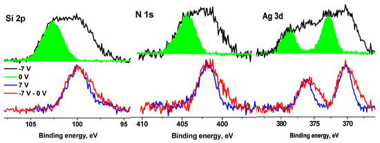 To determine the relative proportion of the phase with low electrical conductivity in the spectra measured at Ub = −7 V (Figure 14), the high-energy regions are approximated by the spectra measured at Ub = 0 V. These proportions are: Si-0.43, N-0.45, Ag-0.35, C-0.38 and O-0.34, and the corresponding composition can be expressed with the formula C28.2O6.3N1.2Ag0.2Si1.8. The composition of other phases corresponds to the formula C45.9O12.3N1.5Ag0.4Si2.3. It should be noted that, in both cases, the Si/N ratios are close to 1.5 and 1.6, respectively, which indicates that the aminosilane structure is retained, while the Si/Ag ratio in the first case is 1.5 times higher than in the second. However, since the concentration of Ag in relation to aminosilane is higher in regions with low electrical conductivity than in regions with higher electrical conductivity, it can be concluded from this that the Ag NPs located in them are either larger or the oxide shell is thicker.