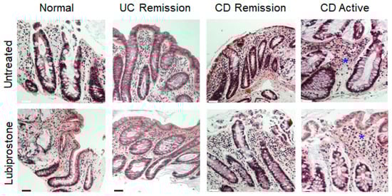An intact epithelium is preserved in biopsies from IBD patients in remission or CD patients with active disease. Hematoxylin and eosin (H&E) staining of formalin-fixed sigmoid colon biopsies derived from control patients, patients with CD or UC in remission, and patients with active CD. Representative biopsies isolated adjacent to the healthy controls and biopsies from Crohn’s disease and UC patients in remission that were subsequently used in “untreated” vs. “lubiprostone”-treatment groups indicated no signs of significant inflammatory disease. CD patients with active disease show increased mucosal immune cell infiltrates (blue asterisk). (scale bar: 200 μm).