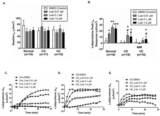 Lubiprostone stimulates ion transport across colonic biopsies from control subjects and IBD patients. (A) Four colonic tissues from individual normal, CD and UC subjects were mounted in Ussing chambers and basal Isc measurements were recorded. No differences in baseline Isc were observed between control (n = 15 subjects), CD (n = 17 subjects), or UC (n = 15 subjects)). (B) Lubiprostone increased Isc in a concentration-dependent manner in all tissues (p < 0.05–p < 0.001; n = 15–16 subjects) compared with DMSO control treated biopsies (n = 14–15 subjects). However, the magnitude of response was lower in tissues from CD and UC patients vs. normal subjects (p < 0.05; n = 15). (C) Representative time course of the Isc response to lubiprostone in control colonic biopsies. (D) Representative time course of the Isc response to lubiprostone in Crohn’s disease colonic biopsies. (E) Representative time course of the Isc response to lubiprostone in UC colonic biopsies. *, p < 0.05; **, p < 0.01; ***, p < 0.001 vs. DMSO (control). #, p < 0.05; ###, p < 0.001 vs. Isc response to equivalent dose of lubiprostone in tissues from non–IBD (‘normal’) subjects.