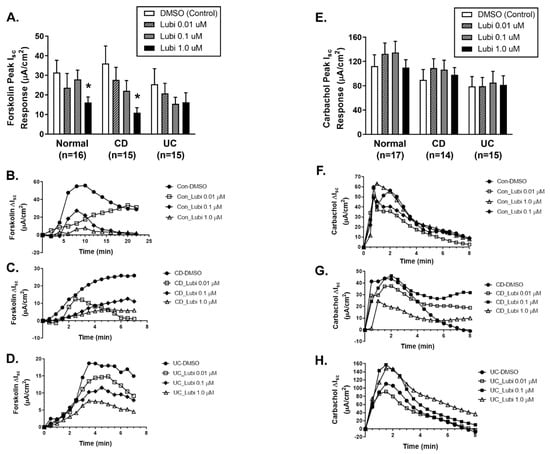 Lubiprostone inhibition of cAMP but not Ca2+-dependent colonic ion transport is differentially preserved in CD vs. UC. Four colonic tissues from individual normal (n = 16), CD (n = 15) and UC (n = 15) subjects in remission were mounted in Ussing chambers. Individual biopsies from each subject in each disease group were pre–treated with (i) DMSO–Control; (ii) 0.01 mM; (iii) 0.1 mM; or 1.0 mM Lubiprostone for 30 min before subsequent challenge with the cAMP agonist forskolin (20 μM; bilaterally, (A–D)) or the Ca2+-dependent agonist carbachol (CCh; 300 μM; serosally; (E–H)) and Isc responses were measured. (A). Overall Isc responses to forskolin were similar in control, CD and UC tissues, while lubiprostone reduced the Isc response to forskolin in a dose-dependent manner. This effect was significant in control and CD biopsies (p < 0.05; n = 15–16). (B). Representative time course of the Isc response to forskolin in control colonic biopsies. (C). Representative time course of the Isc response to forskolin in Crohn’s disease colonic biopsies. (D). Representative time course of the Isc response to forskolin in Ulcerative colitis colonic biopsies. (E). The Isc response to CCh was similar in all three subject groups and was unaffected by lubiprostone pre-treatment (n = 15–17 subjects). (F). A representative time course of the Isc response to carbachol in control colonic biopsies. (G). Representative time course of the Isc response to carbachol in Crohn’s disease colonic biopsies. (H). Representative time course of the Isc response to carbachol in ulcerative colitis colonic biopsies. *, p < 0.05 vs. DMSO (control).