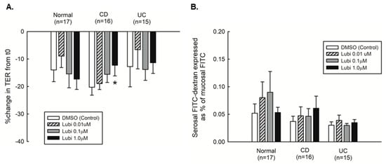 Lubiprostone selectively improves colonic mucosal barrier function in quiescent Crohn’s disease. Four colonic tissues from individual normal (n = 17), CD (n = 16) and UC (n = 15) subjects in remission were mounted in Ussing chambers. Individual biopsies from each subject in each disease group were treated with (i) DMSO–Control; (ii) 0.01 mM; (iii) 0.1 mM; or 1.0 mM Lubiprostone and changes in transepithelial electrical resistance (TER) and FITC-dextran 4kD (FD4) permeability were measured over two hours. (A). Lubiprostone increased the diminished TER in CD biopsies in a concentration-dependent manner with a peak improvement of 8 ± 3% (1.0 µM; n = 17, p < 0.05) over 120 min vs. untreated. Lubiprostone had no significant effect on UC or normal control biopsies. (B). FITC–dextran 4kD permeability was not significantly altered in CD or UC vs. normal controls and was unaffected by lubiprostone. *, p < 0.05 vs. DMSO (control).
