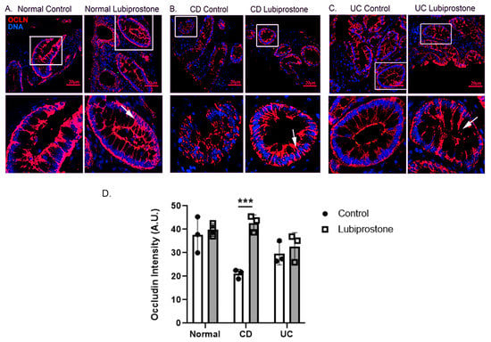 Lubiprostone (1.0 μM; 120 min) did not appear to modulate localization of the TJ protein occludin (red) in colonic biopsies from normal control subjects (Figure 5A). However, apical and lateral localization of occludin (arrows) was increased in lubiprostone-treated CD patient biopsies vs. vehicle control CD biopsies (Figure 5B,D). In contrast, lubiprostone did not appear to increase the intensity of occludin staining in the lateral junctions of UC biopsies to the same extent as CD biopsies (Figure 5C).