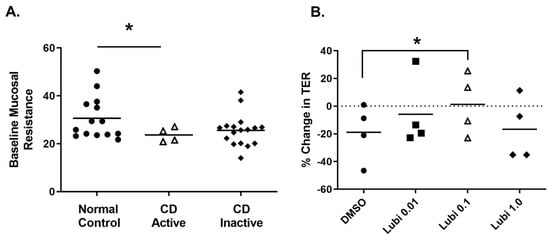 We next determined if lubiprostone could also improve TER in biopsies from patients with active CD. Biopsies from Crohn’s patients with active disease had a significantly lower resting baseline mucosal TER than control subjects (p < 0.05; Figure 6A). We next tested the effect of increasing concentrations of lubiprostone on TER of active CD biopsies mounted in Ussing chambers. Lubiprostone induced a significant increase in TER only at the 0.1 μM concentration compared with vehicle control (DMSO only) (p < 0.05; Figure 6B).
