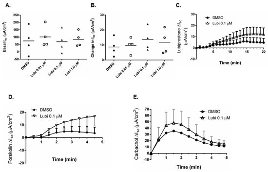 We next investigated whether the improvement in TER induced by lubiprostone in biopsies from patients with active CD was associated with a lubiprostone-stimulated ion transport response. The baseline Isc for tissues subsequently treated with either vehicle control (DMSO) or lubiprostone (0.01, 0.1, 1.0 μM) that effectively increased TER (c.f. Figure 5B) was equivalent (Figure 7A). Lubiprostone treatment of active CD biopsies mounted in Ussing chambers did not induce a significantly greater ion transport response than vehicle control, as shown by calculation of the peak ion transport response (Figure 7B) and in a representative trace (Figure 7C) of the concentration of lubiprostone (0.1 μM) that effectively increased TER (c.f. Figure 5B), despite doing so in biopsies from CD patients in remission (c.f. Figure 2B). This indicates that the ion transport machinery involved in mediating the response to lubiprostone in biopsies from CD patients in remission was desensitized or non-responsive to the same stimulus in active CD and was likely not required for the improved TER observed in Figure 5B. In addition, lubiprostone did not suppress the Isc response to subsequent exposure to forskolin or carbachol (Figure 7D,E).